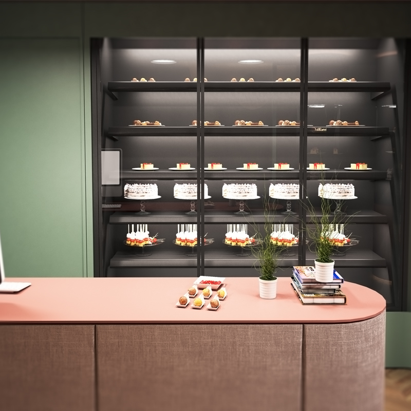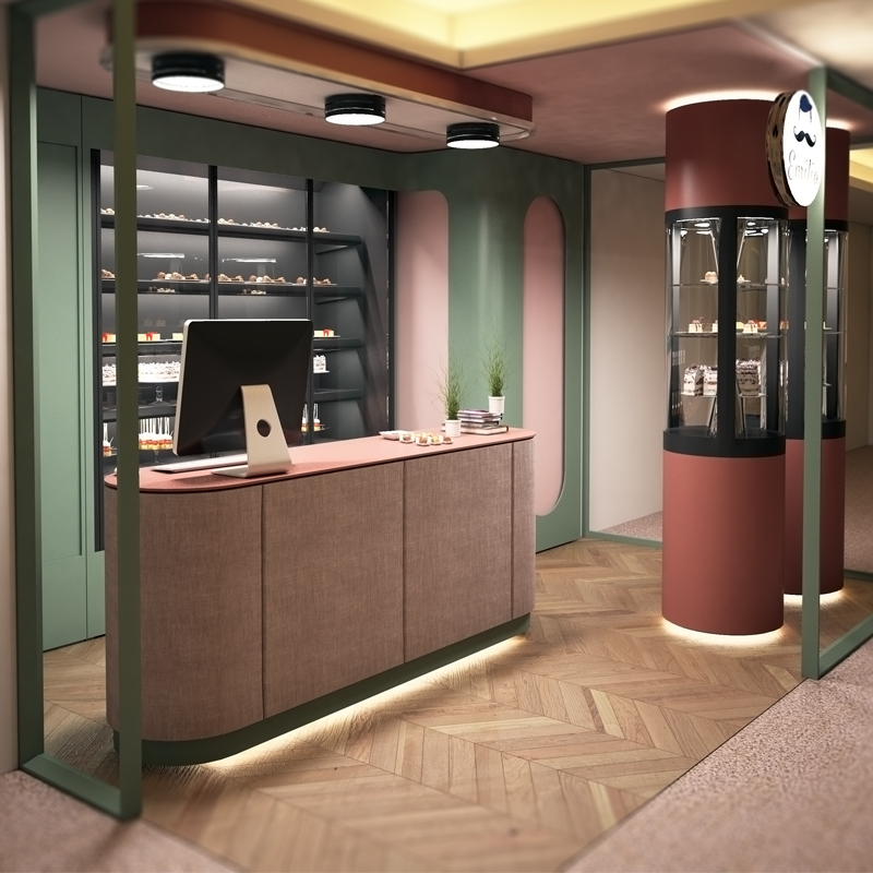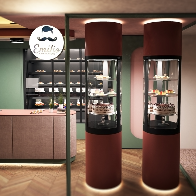 Un design potrivit pentru un spatiu comercial relativ mic, destinat prezentarii si servirii de produse de cofetarie. Am folosit frigidere expozoare de culoare inchisa pentru o mai buna vizibilitate in contrast a produselor si a evidentierii acestora.Culorile retro au fost utilizate in ideea de a aduce in context modul in care erau prajiturile odinioara cele din ingrediente simple ,pline de gust si arome.