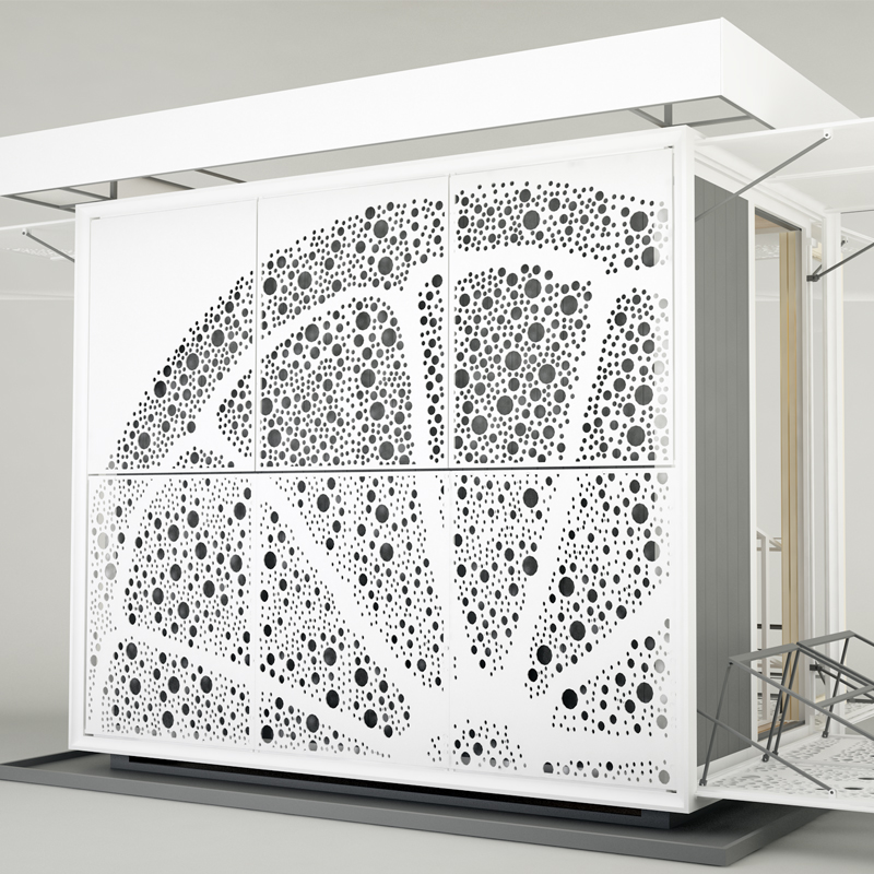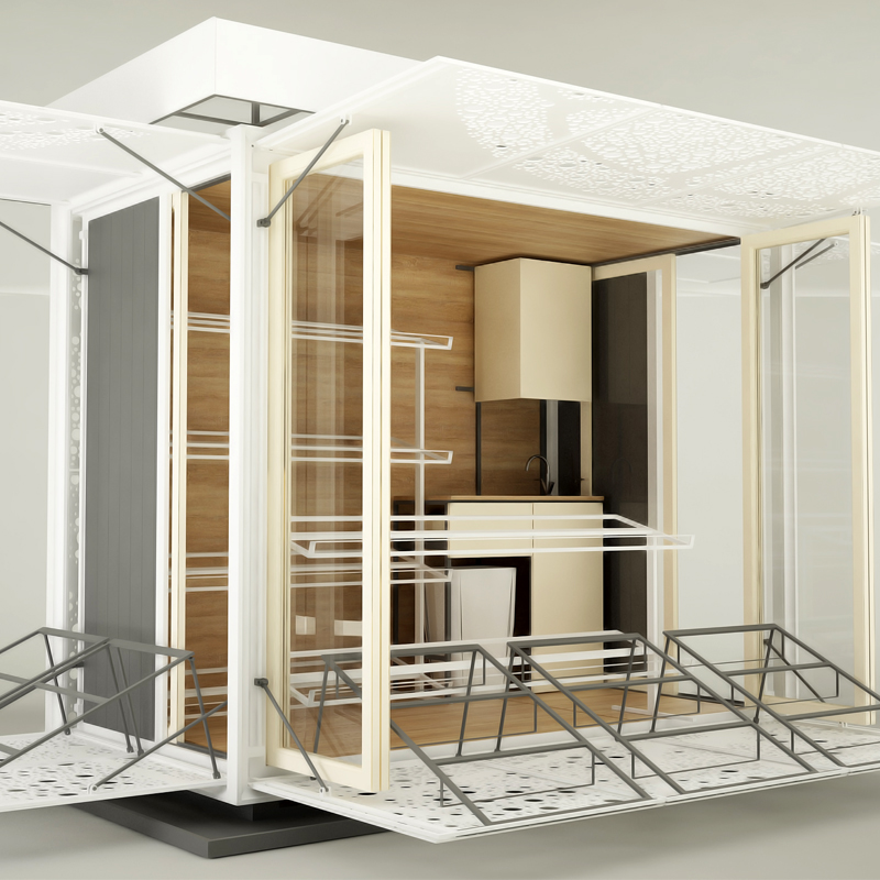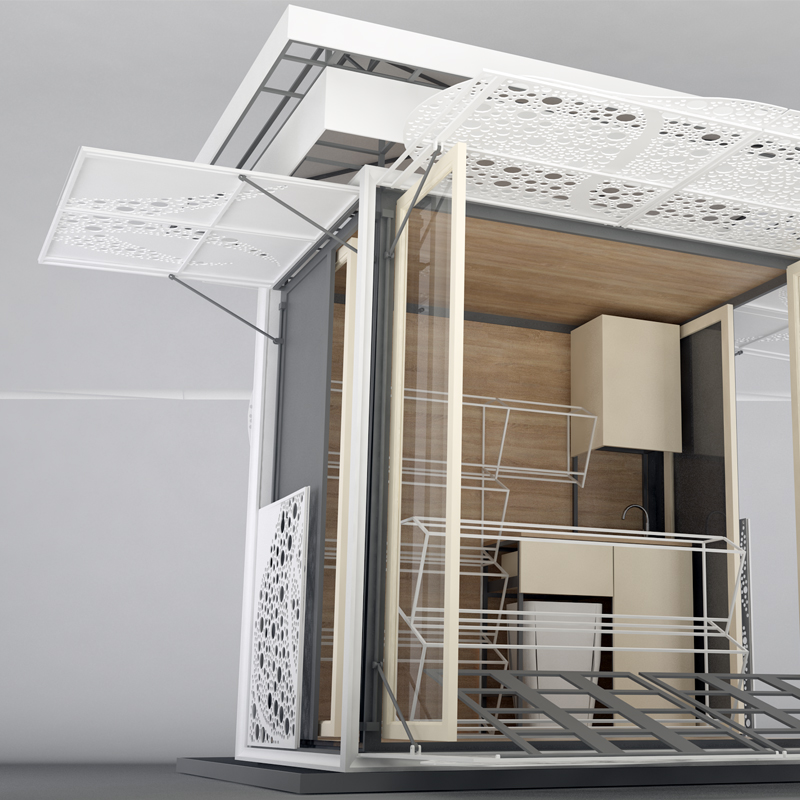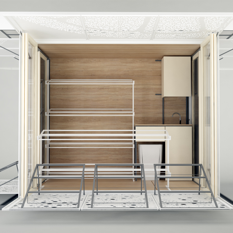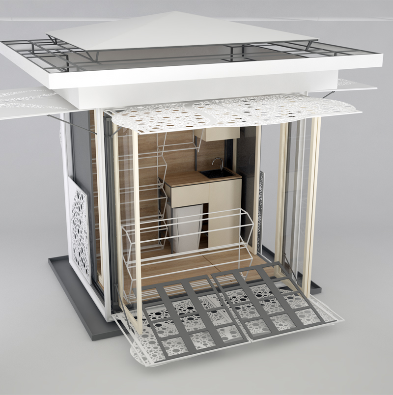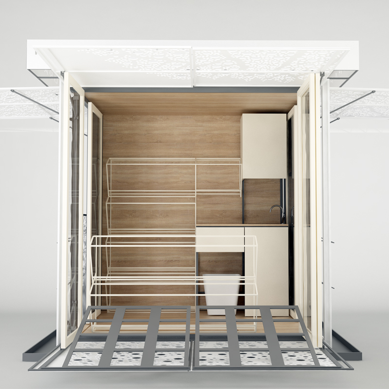 O sugestie de spatiu comercializare stradala (tonete),am folosit o metoda de extindere a suprafetei din peretele exterior,folosind acesta ca structura de depozitare/expunere.Am reusit sa cream un proiect ce se pliaza perfect pe necesitatile micilor afaceri.