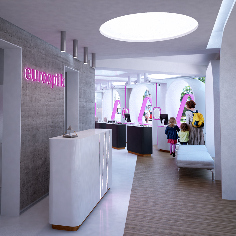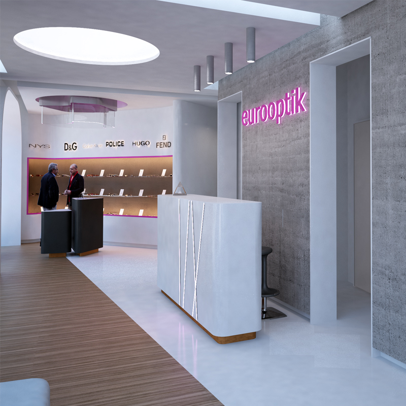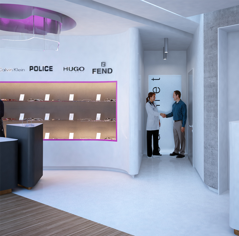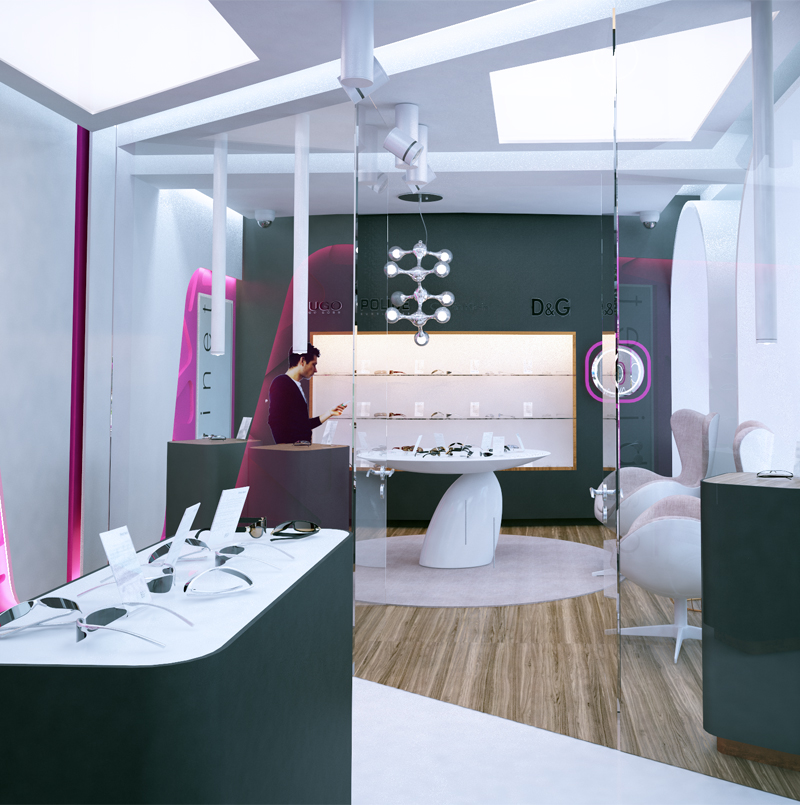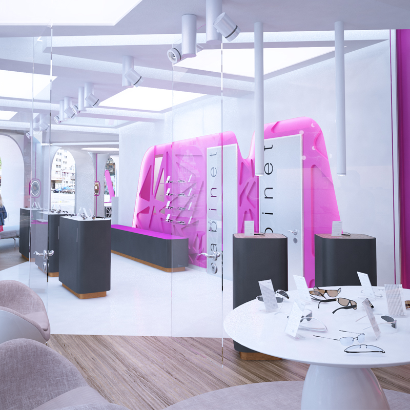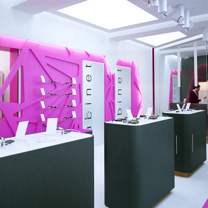 Un spatiu destinat consulatiilor oftalmologice si comercializarii de ochelari si accesorii specifice. Clientul nostru a optat pentru non-culori in cadrul acestui design distorsionand usor monotonia cu ajutorul panoului de expozitie de culoare fuxia .