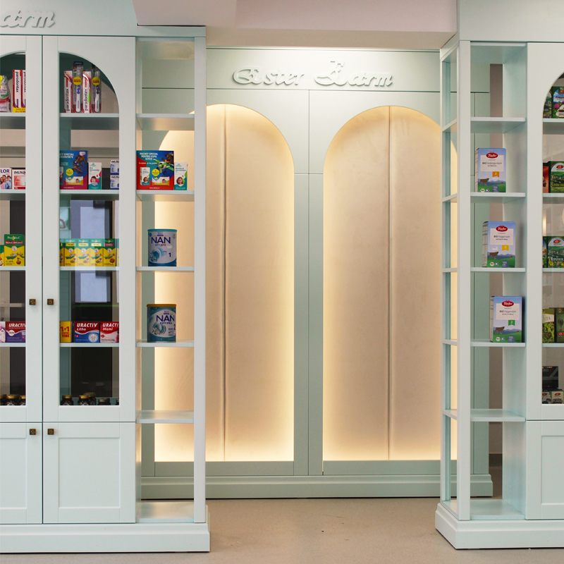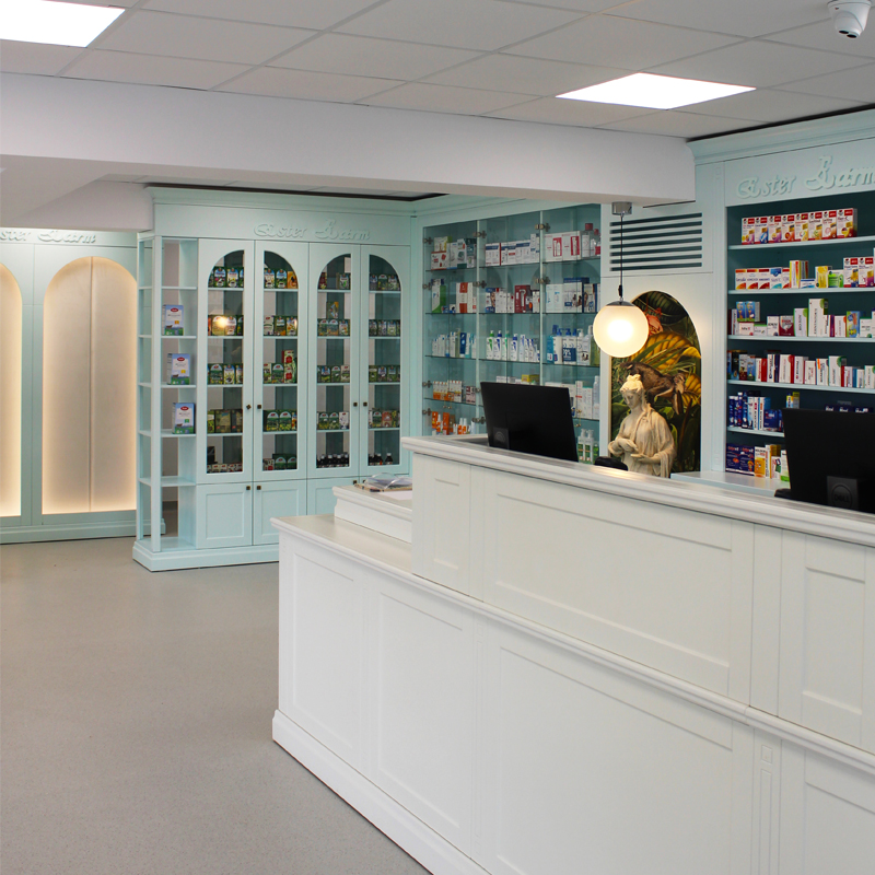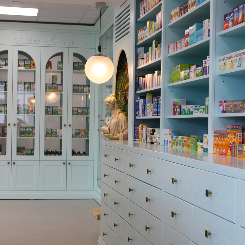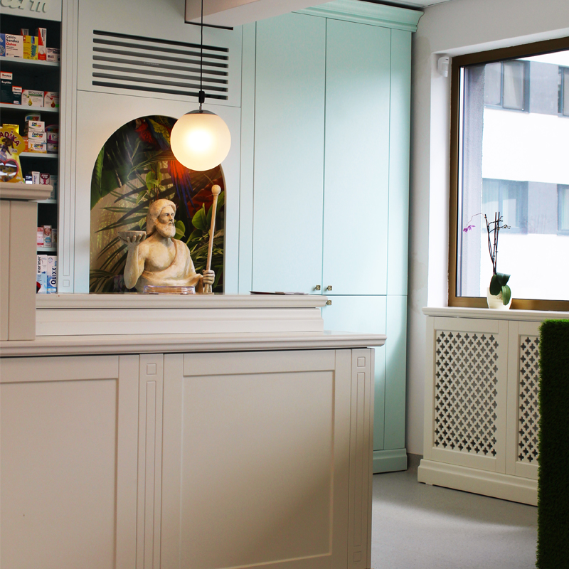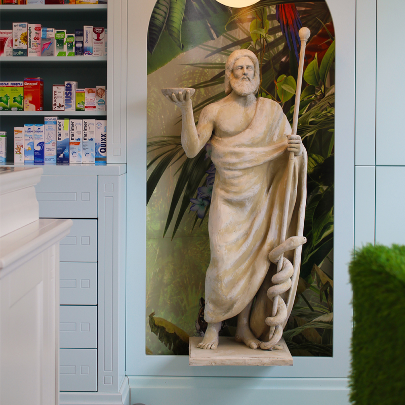 Privind în trecut, uităm de imaginea farmacistului în halat alb și descoperim zeități din mitologia greacă, precum Asclepios venerat ca fiind ”zeul medicinei și vindecătorul suprem” alături de cele două fiice Hygeia care ține în mână o cupă din care bea șarpele (în prezent, simbolul farmaciei) și Panaceea, zeița care vindecă toate bolile.In cadrul „tabloul” nostru final am tinut cont de aceste specificatii importante remodeland ideile unei farmacii simple si monotone,si redandu-i un aspect modern dar cu legaturi directe in trecut si totodata indicand relatia directa dintre plante ,efectele lor tamaduitoare si medicamentele de astazi.